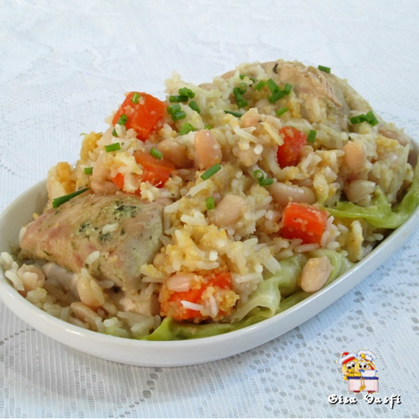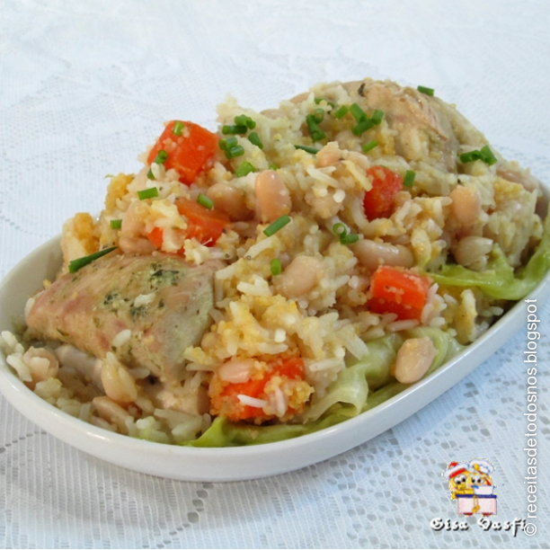 Quando o frango tiver dourado, acrescente o arroz, refogue um pouco e junte os legumes, menos a ervilha, e o açafrão.