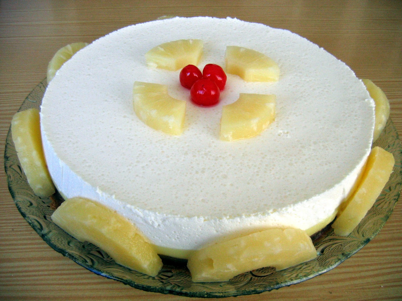 Cortar metade das rodelas de ananás em pedacinhos. Numa taça, misturar as natas com os iogurtes, juntar a gelatina fria e os pedaços de ananás e misturar bem.