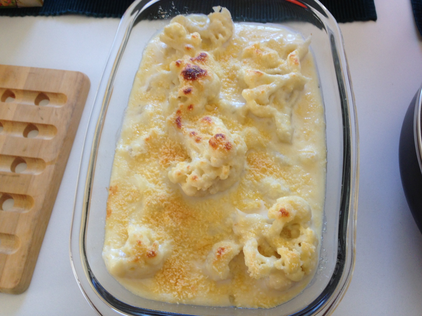 Coloque a couve flor já cozida em um pirex, cubra com o molho acima, salpique queijo ralado à gosto e leve ao forno apenas para gratinar.