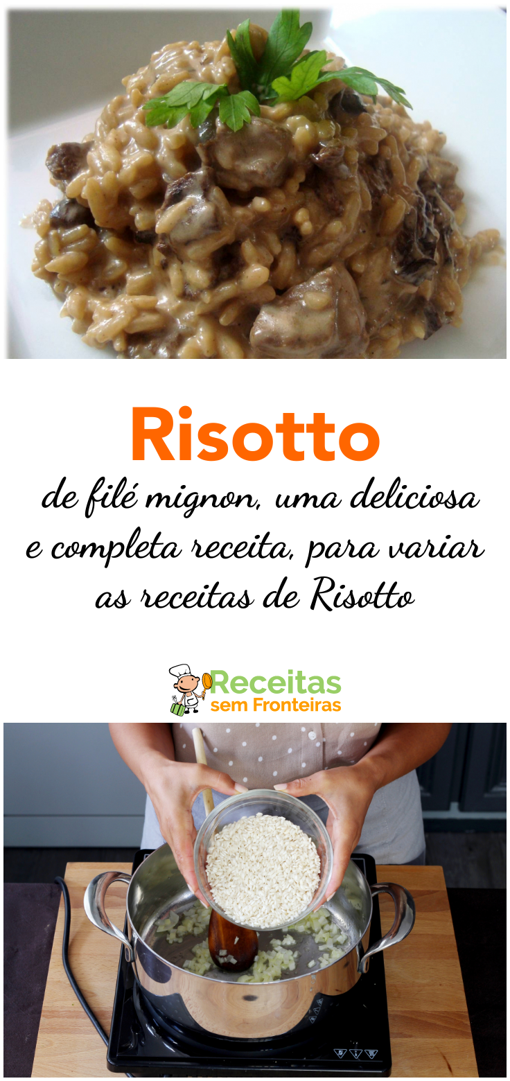 Temperar o filé mignon com sal e pimenta do reino. Saltear e carne em uma panela com azeite, de modo que ela fique levemente cozida por fora e ainda crua por dentro. Reservar. Em uma panela, refogar a cebola com a manteiga e um fio de azeite, fritar o arroz, adicionar o vinho branco e mexer até evaporar. Aos poucos adicionar o caldo de carne, mexendo sempre. Quando estiver mais ou menos na metade do preparo, adicionar o filé mignon. Continuar mexendo e adicionando o caldo de carne aos poucos até o arroz estar al dente. Desligar o fogo e adicionar o queijo parmesão.