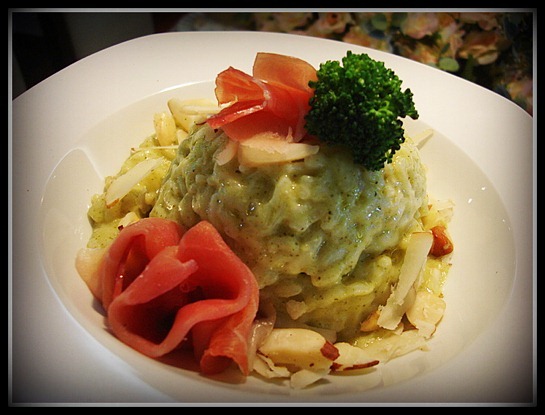 e juntar todo o liquido de uma só vez. Abaixar o fogo e ficar mexendo sempre. Quando o arroz soltar todo o amido e adquirir uma consitência cremosa, desligue o fogo e junte 1 pote de requeijão e o presunto. Desligue o fogo, tampe a panela e espere 2 minutos para servi-lo. Finalizei com fatias do presunto e flores de brócolis. Ralei também algumas castanhas do Pará e salpiquei em volta.