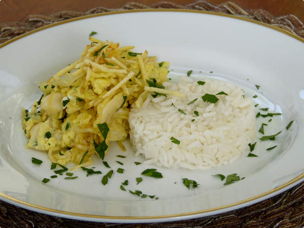Derrame os ovos batidos sobre o bacalhau