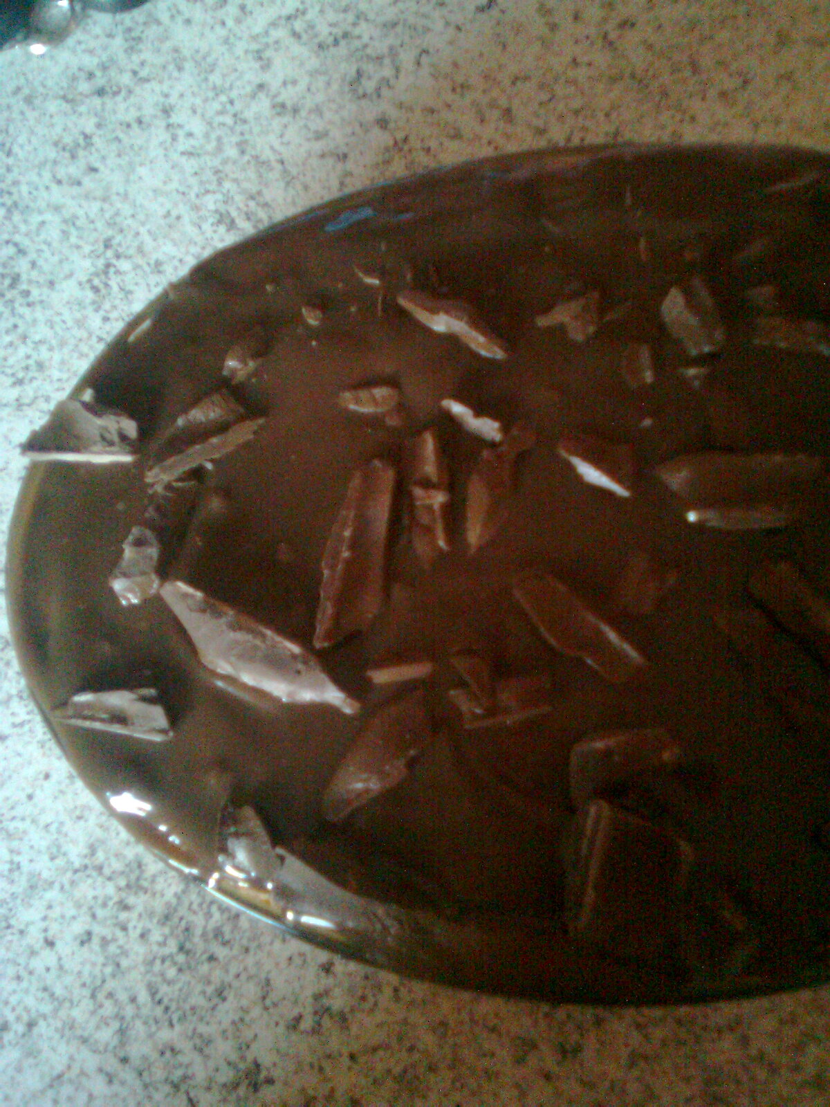 EM UMA PANELA ADICIONE METADE DE UMA CAIXA DE LEITE CONDENSADO, UMA COLHER DE MANTEIGA OU MARGARINA E 2 COLHERES DE SOPA DE CHOCOLATE EM PÓ. MEXA ATÉ FICAR EM PONTO DE BRIGADEIRO E APÓS DESPEJE SOBRE O BOLO.