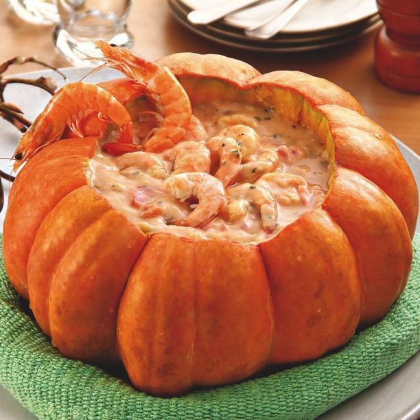 Montagem: coloque parte do requeijão cremoso na moranga (forre as laterais e o fundo). Adicione um pouco de camarão, depois molho e novamente o camarão. Finalize com o requeijão cremoso. Coloque a tampa da moranga e leve ao forno por cerca de 15 minutos.
