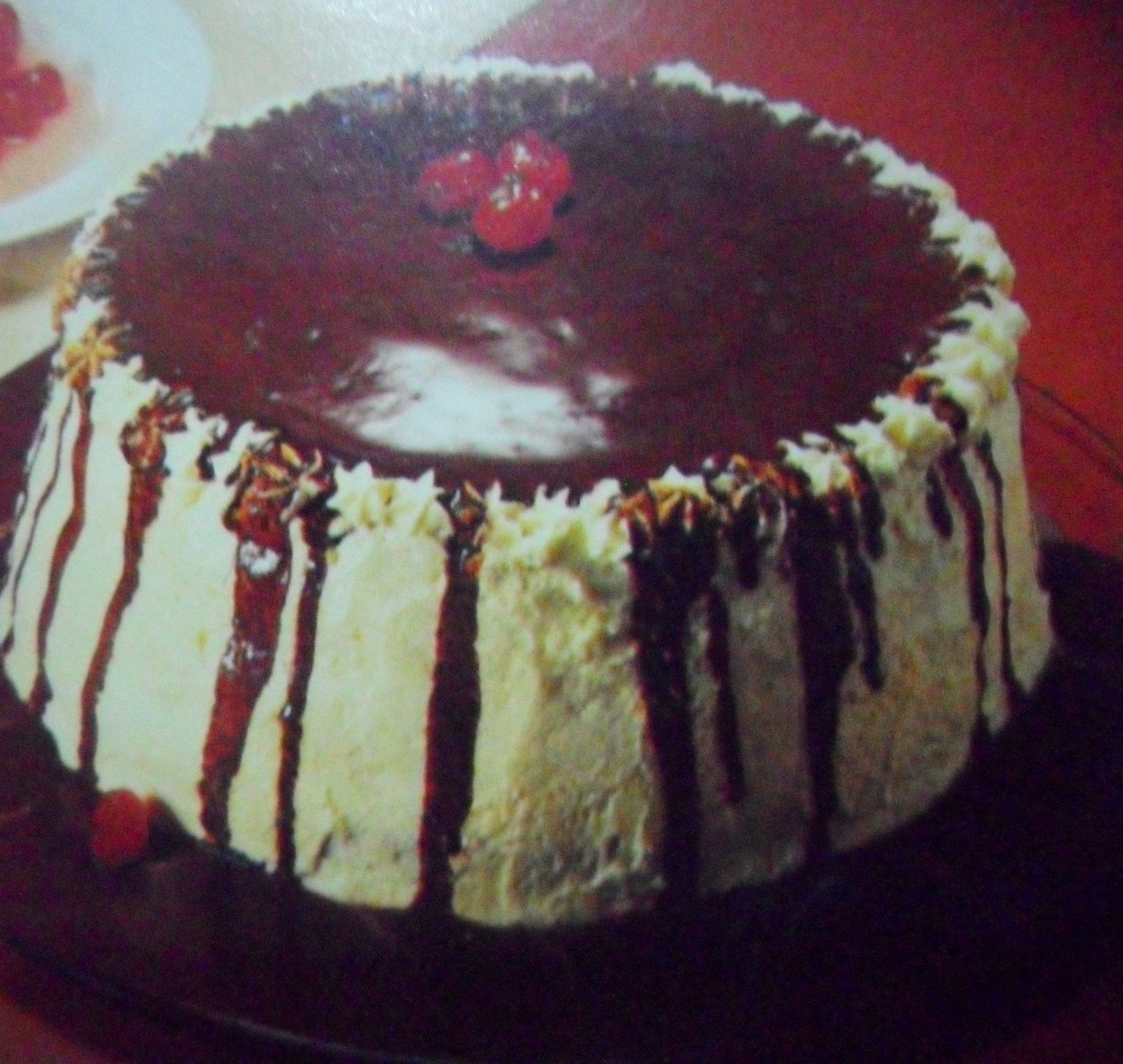 Montagem: corte os 2 bolos ao meio. Regue os com o rum misturado à água e recheie o intervalo entre as camadas com o chantili. passe-o também nas laterais do bolo. no topo deste derrame a calda de achocolatado e decore com cerekas