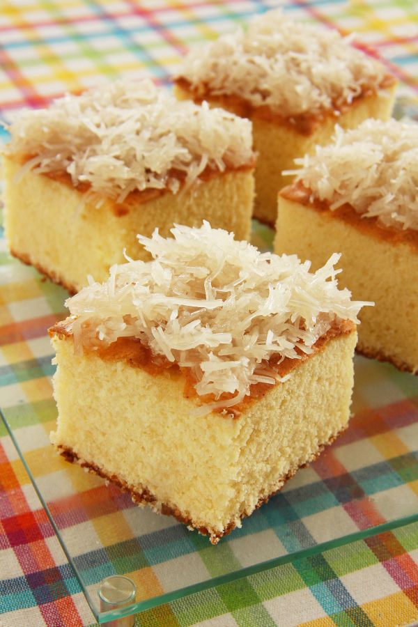 Enquanto isso, misture o coco ralado com o leite para hidratar. Retire o bolo do forno, fure com um garfo e ainda quente na própria fôrma cubra-o com o LEITE MOÇA® e o coco ralado umedecido. Corte-o em quadrados e sirva.