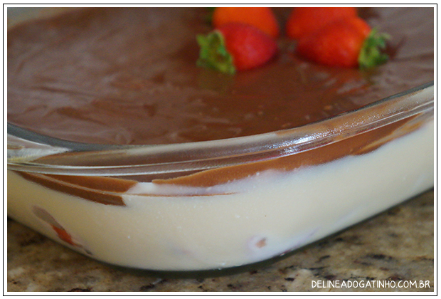 Disponha as furtas em uma travessa jogando por cima o creme de leite condensado e cobrindo com o chocolate derretido.