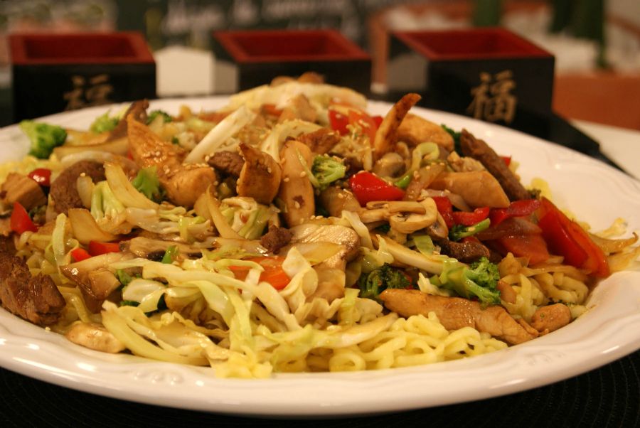 CORTE A CENOURA,ACELGA EM CUBOS MEDIOS E FINOS COZINHE A CENOURA A VAGEM E O BROCOLIS AO DENTE TEMPERE O FRANGO COM ALHO E 50ML DE MOLHO SHOYU RESERVE COZINHE O MACARAO AO DENTE E RESERVE DEPOI REFOGUE O RESTO DO ALHO A CEBOLA ,PIMENTAO TOMATE COLOQUE OS CUBOS DE FRANGO ATE FRITAR UMPOUCO DEIXANDO MACIO RESERVE O MOLHO QUE TEMPEROU O PEITO DE FRANGO FRITE NO AZEITE OU OLEO DE GERGELIN A CENOURA O BROCOLIS A VAGEM A ACELGA E O MACARRAO POR TREZ MINUTOS DEPOIS MISTURE COM O FRANGO COM O MOLHO SHOYU COLOQUE 1 COLHER DE AMIDO DE MILHO NO FOGO ATE ENGROSSAR UM POUCO COLOQUE POR CIMA DO MACARRAO JA PREPARADO E PROTO PODE SERVIR