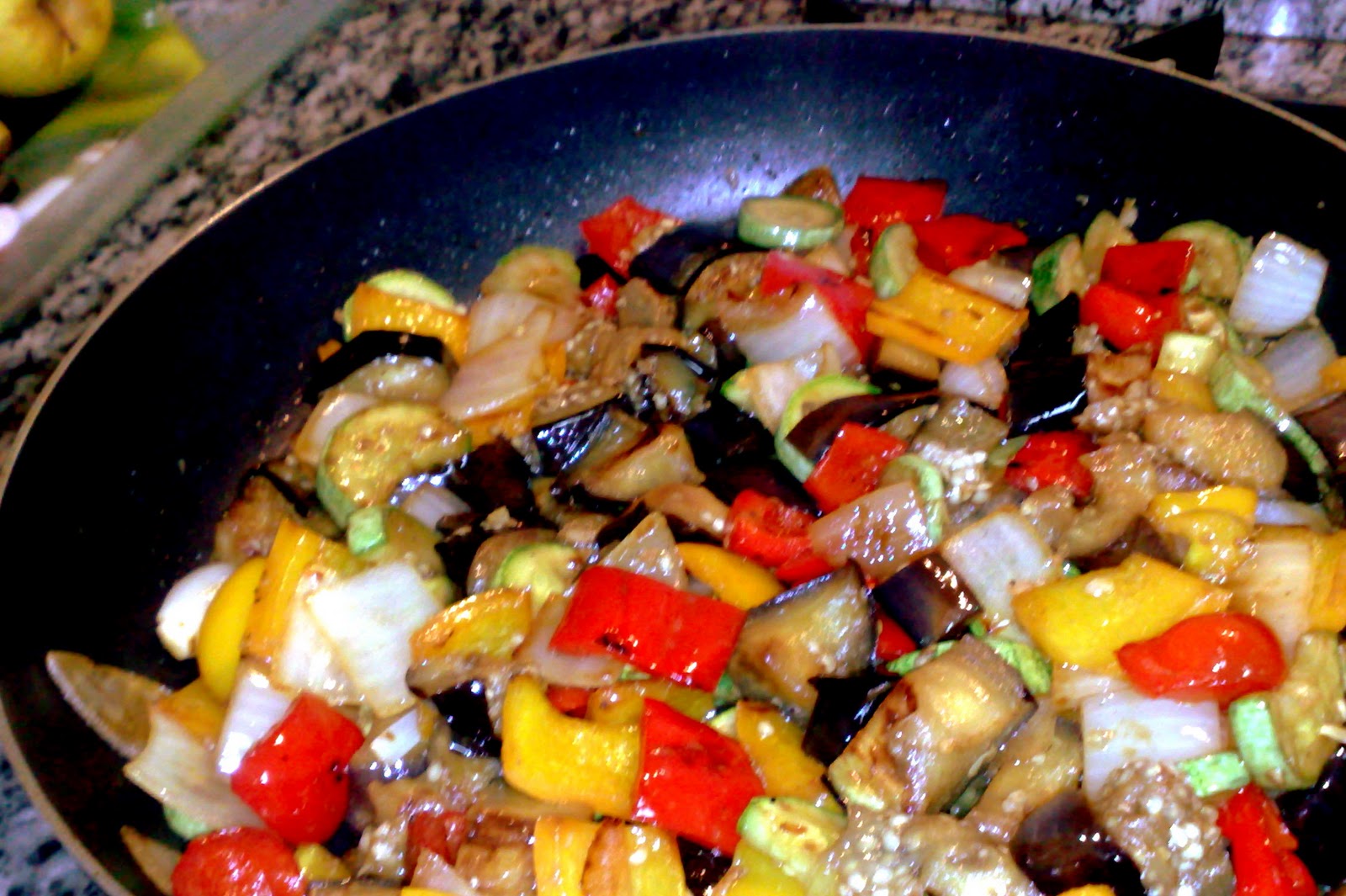 Em uma panela, aqueça o azeite e doure a cebola e o alho com o açúcar. Junte o tomate, o pimentão, a berinjela e a abobrinha e cozinhe por cerca de 30 minutos, em fogo baixo, com a panela tampada.