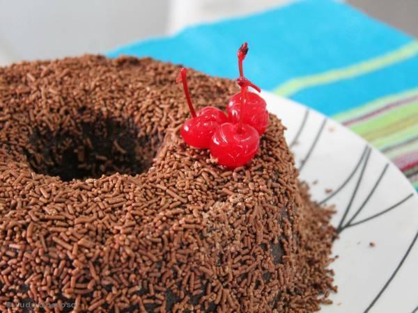 Coloque em uma forma anel untada e leve ao microondas na potência 10 de 7 a 8 minutos enfeite com chocolate granulado e bom apetite