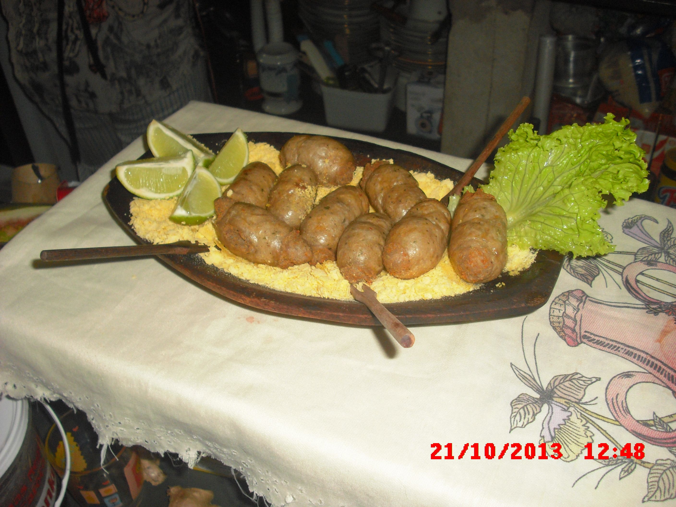 Feita com CMS (carne mequanicamente separada) de peixe, toucinho de porco, temperos e tripa de carneiro.