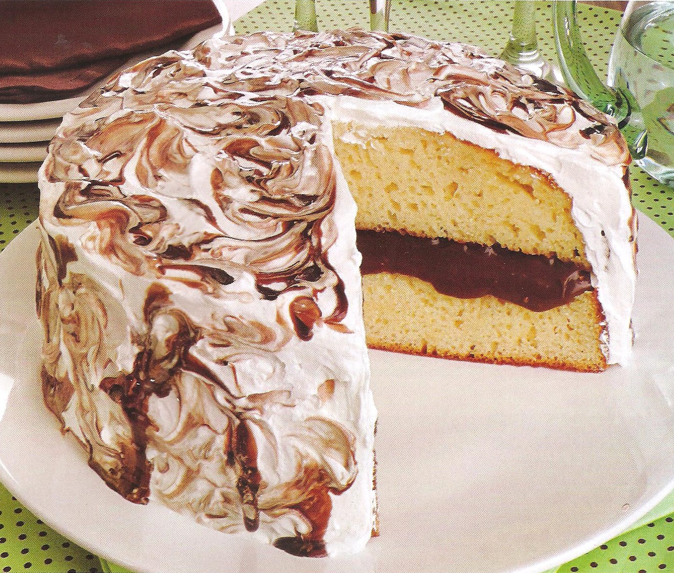 Espalhe o chantilly sobre todo o bolo e decore com a calda de chocolate. Leve à geladeira por 2 horas e sirva.