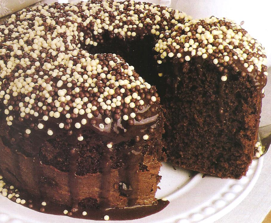 Espalhe a calda sobre o bolo. Decore com confeitos de bolinhas e sirva.