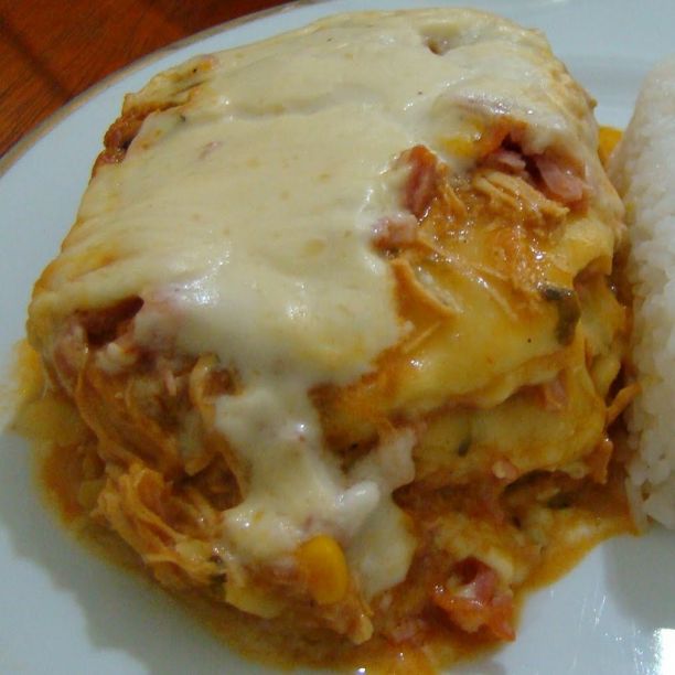 Faça a base com massa de lasanha, cubra com 1 camada de presunto, 1 de queijo e 1 frango (nessa ordem)