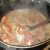 Ponha alho, tomate, pimentão e cebola na panela com um pouco de óleo e azeite; quando começar a dorar o alho, ponha a água que restou do cozimento do aipim e da abóbora. Já fervendo, ponha o cheiro verde, extrato de tomate; mais uns minutos e ponha o aipim/abóbora junto com os siris limpos e escovados.