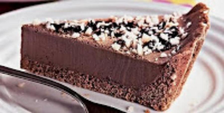 No liquidificador bata o creme de leite, o leite, o restante do iogurte, o chocolate em pó, o açúcar e a gelatina hidratada de acordo com as instruções da embalagem. Despeje sobre a massa já fria e leve à geladeira por no mínimo duas horas. Decore com raspas de chocolate e castanha-do-pará picada.