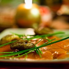 Coloque o pato num prato de servir e decore com um pouco de molho e raspas de laranja. Sirva quente com arroz.