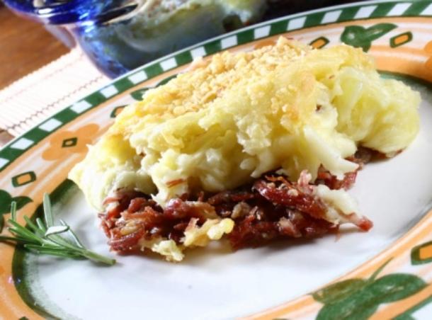 Cozinhe a carne seca e depois de cozida, retire a gordura e desfie em pedaços médios, reserve. cozinhe a mandiocaaté que fique bem macia. Faça um purê com pouco leite (para ressaltar o gosto da mandioca), margarina e sal. Em uma panela, refogue a cebola no azeite. Adicione a carne seca e a salsa e cebolinha, deixe apurar um pouco. Em um pirex coloque o purê de aipim, por cima a carne seca e cubra com um copo de requeijão. Leve ao forno quente rapidamente para derreter o requeijão.