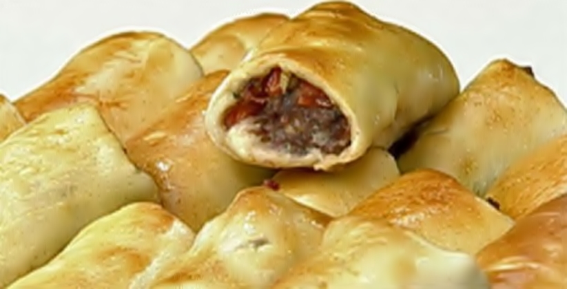 3°- Pegue cada porção de massa e com um rolo abra a massa formando retângulos de 40 cm x 15 centímetros . Coloque 1 ½ xícara (chá) de recheio de carne (reservado acima) no centro da massa no sentido do comprimento sem pressionar e enrole fechando bem. Com uma faca corte o retângulo em 6 partes no sentido do comprimento (+/- 3 cm cada), coloque numa assadeira levemente enfarinhada com a parte fechada para baixo. Com a faca faça 3 cortes superficiais na superfície do pão pincele ovo batido e deixe dobrar de tamanho (+/- 30 minutos).