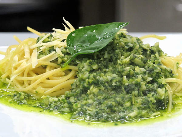 1°- Em uma panela com água fervente, coloque 215 g de folhas de manjericão fresco e deixe na água por 5 segundos até murcharem. Coe as folhas em uma peneira e deixe esfriar. Esprema as folhas a seco e pique grosseiramente. Reserve.