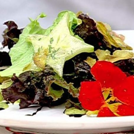 Em uma tigela misture as fatias de salmão, a redução de aceto balsâmico, o molho, as folhas da salada, a carambola, a cebola roxa em fatias e os chips de batata barôa. Misture bem e decore com flores comestíveis.