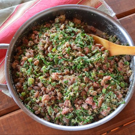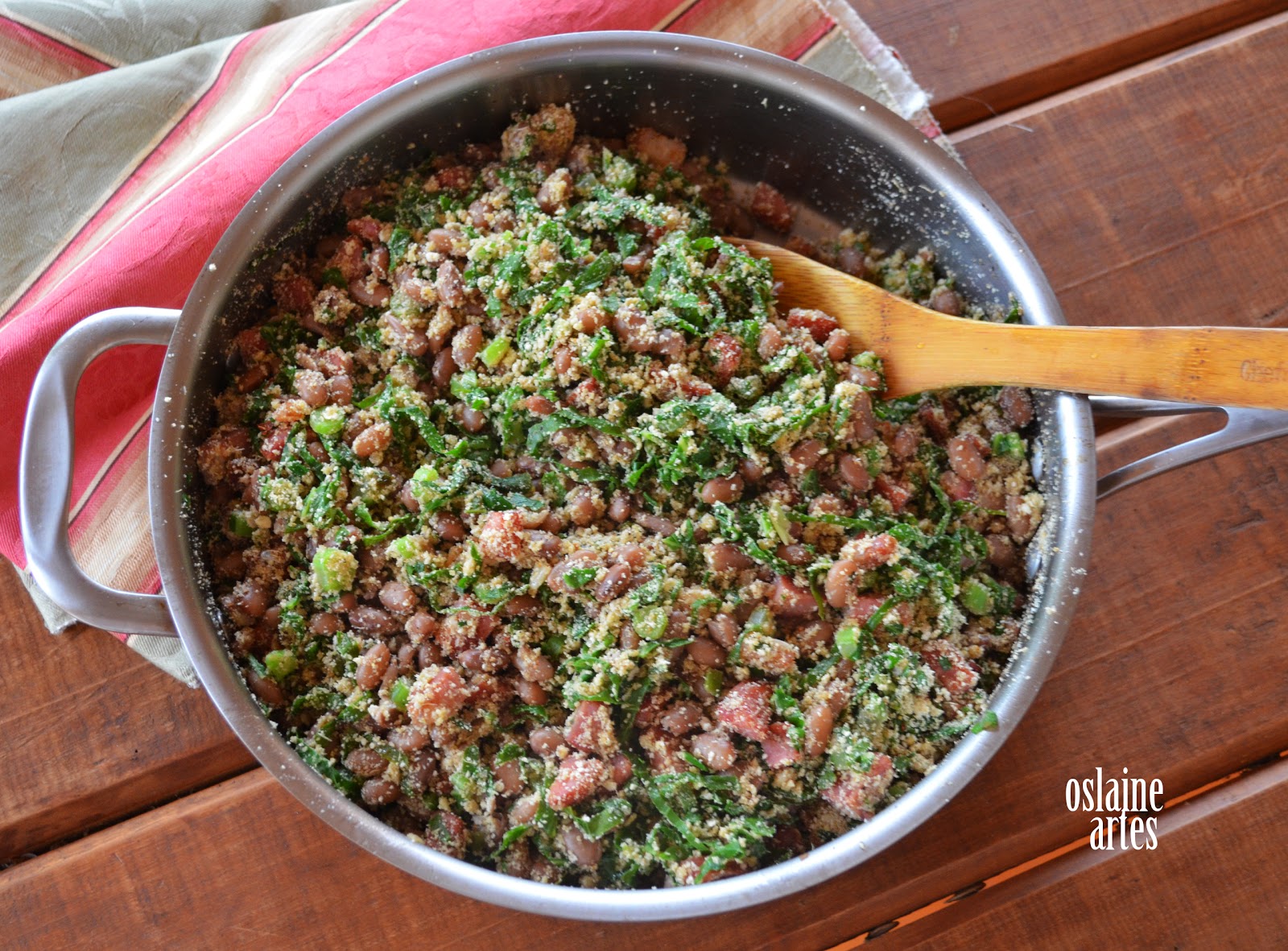 Refogue o feijão, baixe o fogo, misture a farinha aos poucos e o cheiro verde.