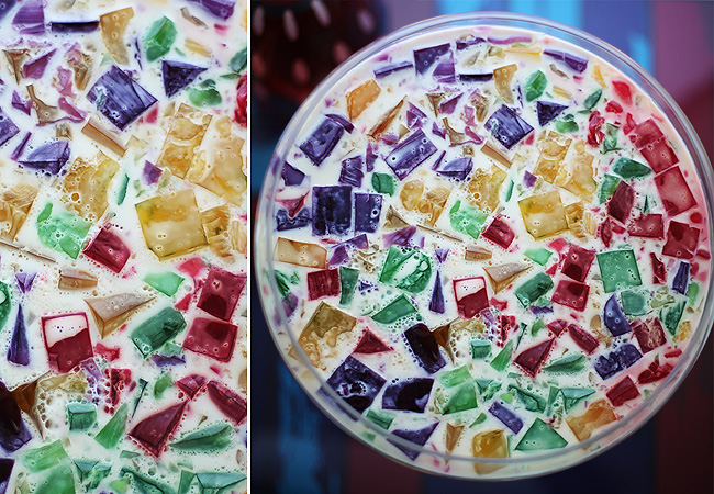 Depois de fria adicione o creme de leite. Bata no liquidificador e coloque em uma vasilha funda. Adicione os cubinhos de gelatina e leve a geladeira.