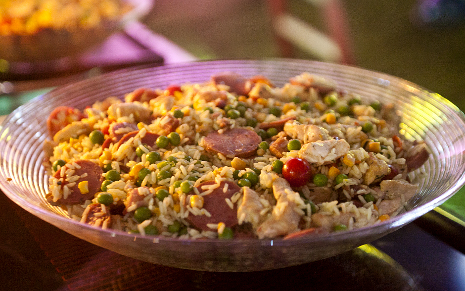 Acrescente o frango desfiado, o arroz, as passas e a salsa.