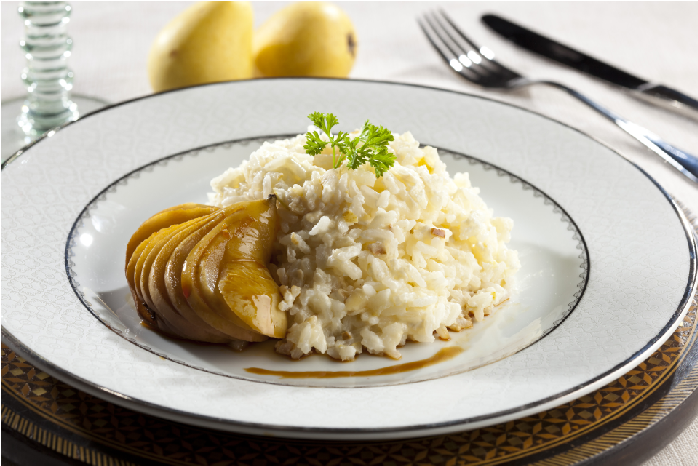 Arroz Com Queijo Brie e Pêra Caramelizada