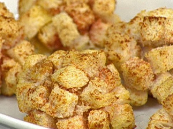 Coloque os croutons em uma assadeira e leve ao forno baixo a 150°C até dourar (aprox. 40 minutos). Retire do forno e sirva em seguida acompanhado de salada verde.