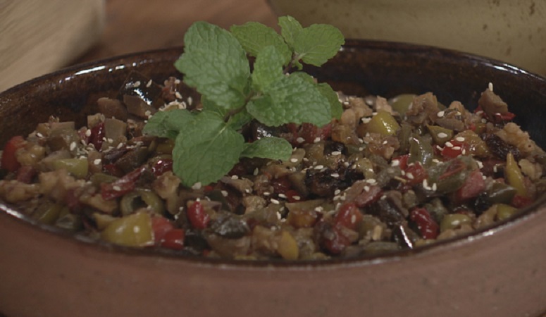 Descasque e corte o alho e a cebola. Refogue em uma panela com azeite. Corte os pimentões e a berinjela em pedaços pequenos e adicione ao alho e cebola para refogar. Finalize com a alcaparra, a uva passa, azeitonas, as nozes e o melaço. Decore com gergelim e hortelã fresca.