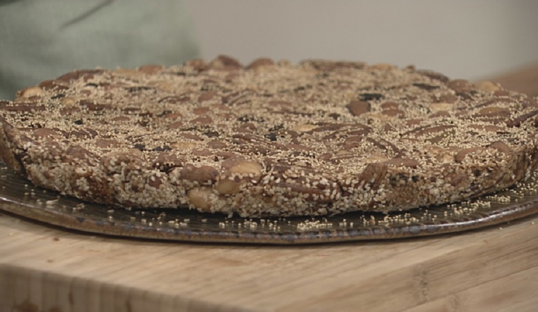 Misture ate formar uma pasta e adicione a mistura das castanhas, juntamente com os ovos. Unte uma forma redonda com óleo de coco e espalhe o gergelim torrado. Coloque a mistura do disco de sementes e prense ate ficar uniforme. Enfeite com amaranto e leve ao forno por 30 minutos a 160 graus.