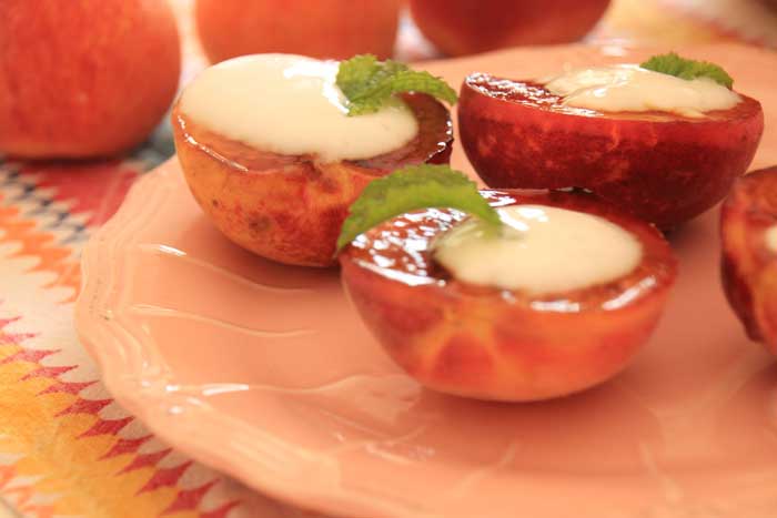 Lave bem os pêssegos e corte-os ao meio retirando cuidadosamente o caroço para que permaneçam inteiros. Polvilhe-os ligeiramente com um pouco de açúcar e coloque-os na chapa (ou numa frigideira anti-aderente) bem quente. deixando-os caramelizar um pouco.