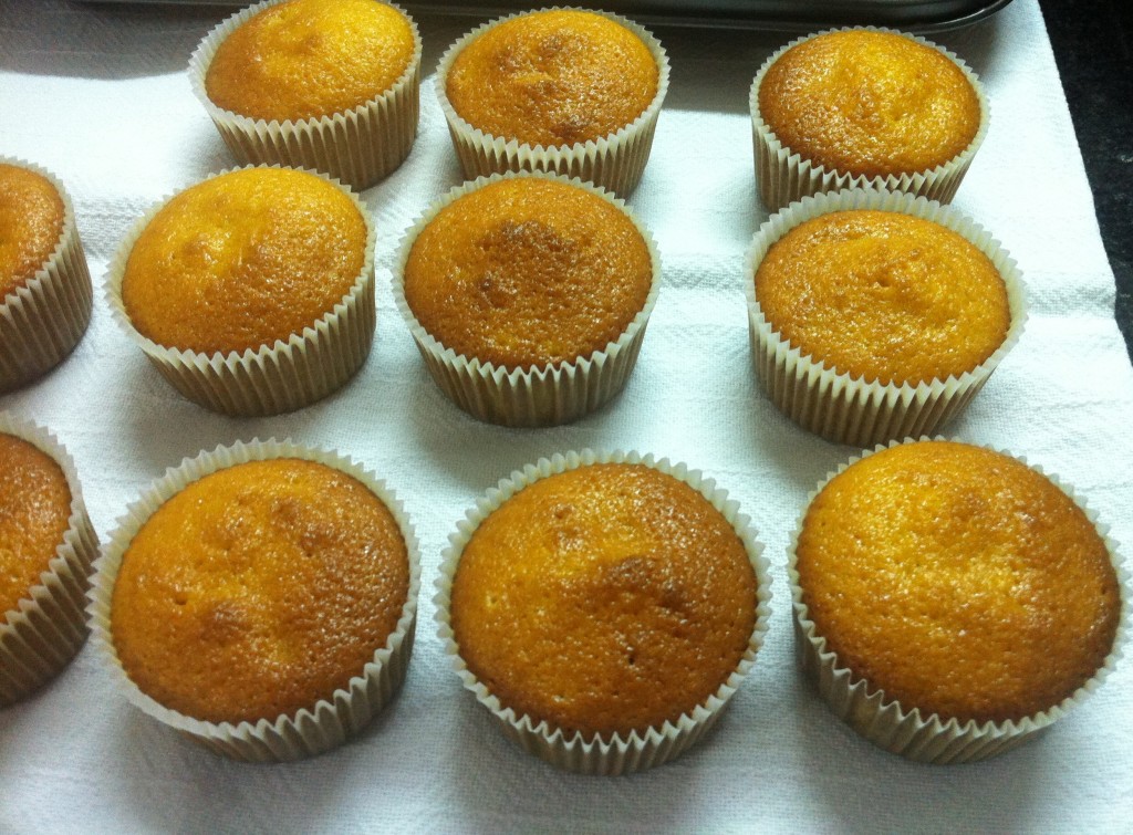 Bata os ovos com o açúcar, acrescente a manteiga derretida, depois as farinhas, a cenoura e o fermento.
