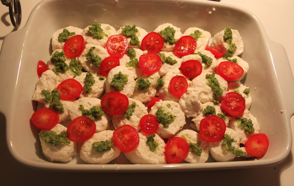 Vá retirando os nhoques com uma escumadeira, um a um, à medida que eles forem subindo para a superfície. Coloque-os em um pirex, sirva com o pesto.
