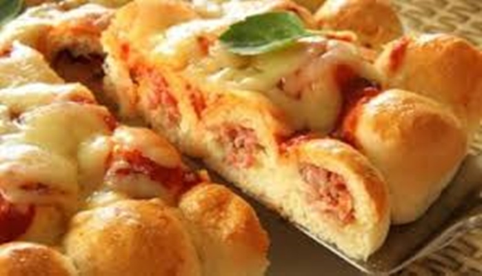 Coloque todas as bolinhas de pizza arrumadas numa forma redonda de pizza, untada e polvilhada com farinha de trigo.