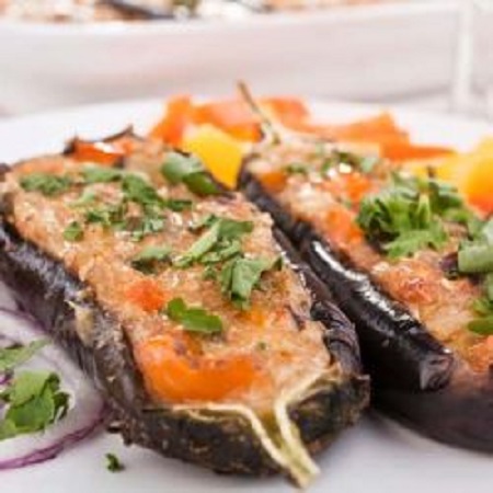 Corte as berinjelas ao meio no sentido do comprimento, faça cortes na sua superfície e cozinhe por cerca de 15 minutos em água temperada com o vinagre. Escorra e deixe esfriar. Bata ligeiramente os ovos e misture com pão ralado, salsa, orégano e sal.