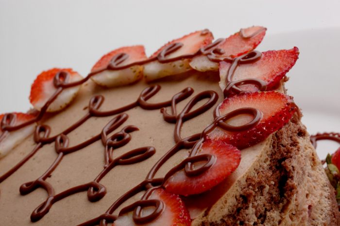 Coloque por cima o outro tablete de chocolate meio amargo, ralado em ralo grosso e decore com os morangos inteiros reservados