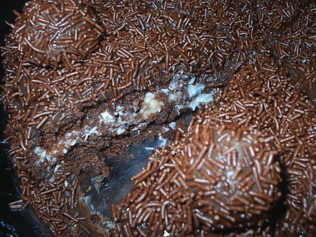 Depois de feito o recheio e a cobertura salpique o coco por cima do bolo