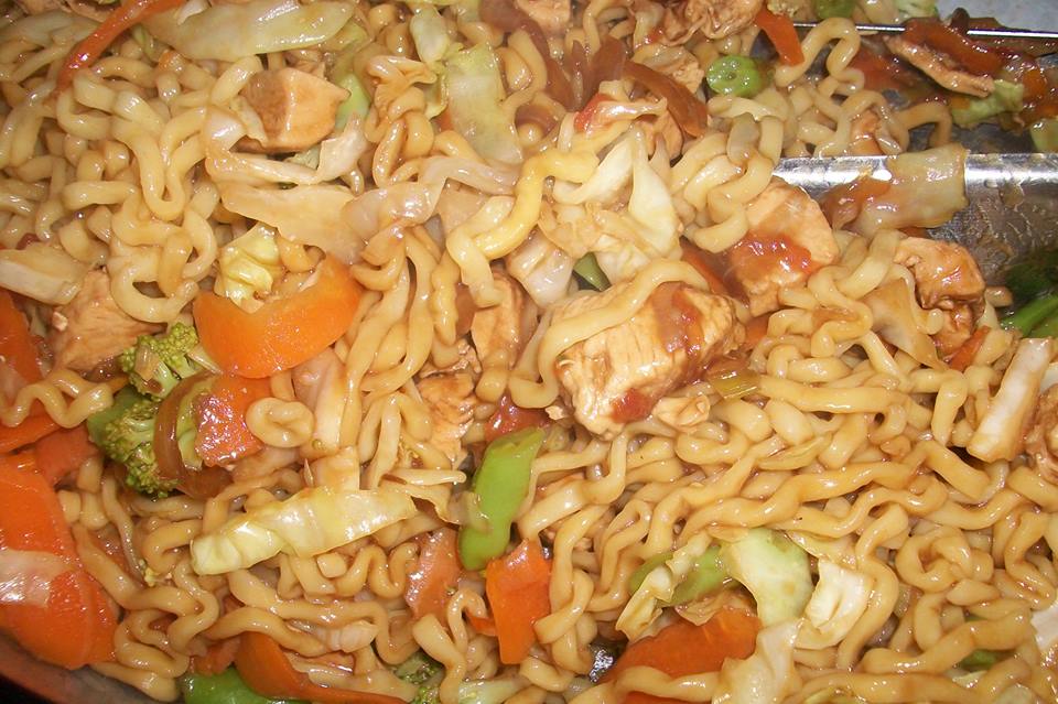 Junte aos legume e ao molho de shoyo o frango e por último o macarrão com os legumes . Sirva ainda quente.