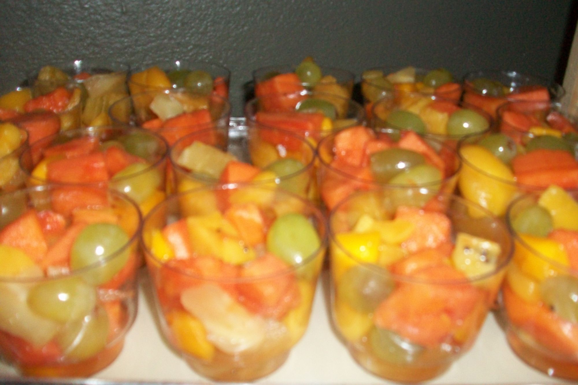 Junte todas as frutas picadas junto com a calda do pêssego para não escurecer as frutas