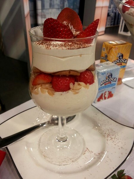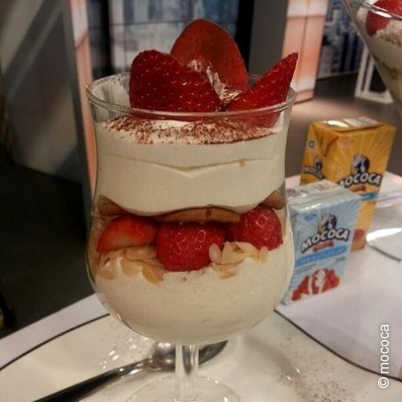 Em uma taça coloque uma camada de biscoitos passados pela calda, uma camada de creme, uma camada de morangos picados, uma camada de amêndoas, repita novamente as camadas, decore com morangos e cacau em pó.