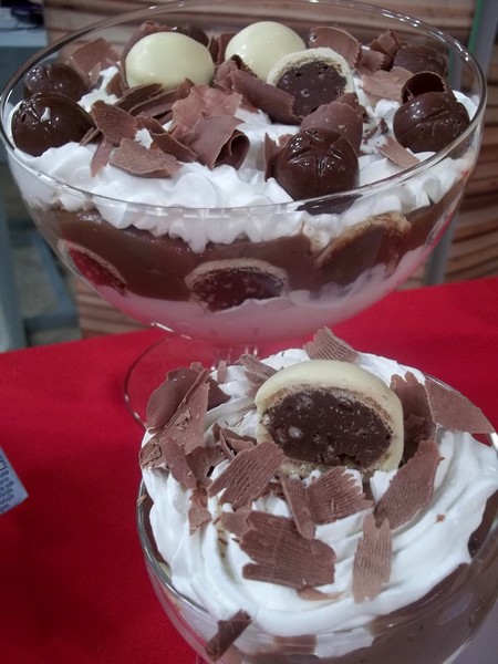 Em uma taça, coloque uma camada do creme branco, a bolacha molhada na calda, bombons picados, uma camada de chantilly, creme de chocolate, bolacha, bombons picados. Termine com chantilly a cobertura, raspas de chocolate e cereja.