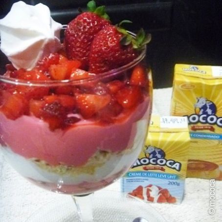 Faça camadas com o creme de morango, morango picado, o chantilly e o suspiro, repita as camadas até preencher o recipiente. Finalize as camadas com morangos picados.