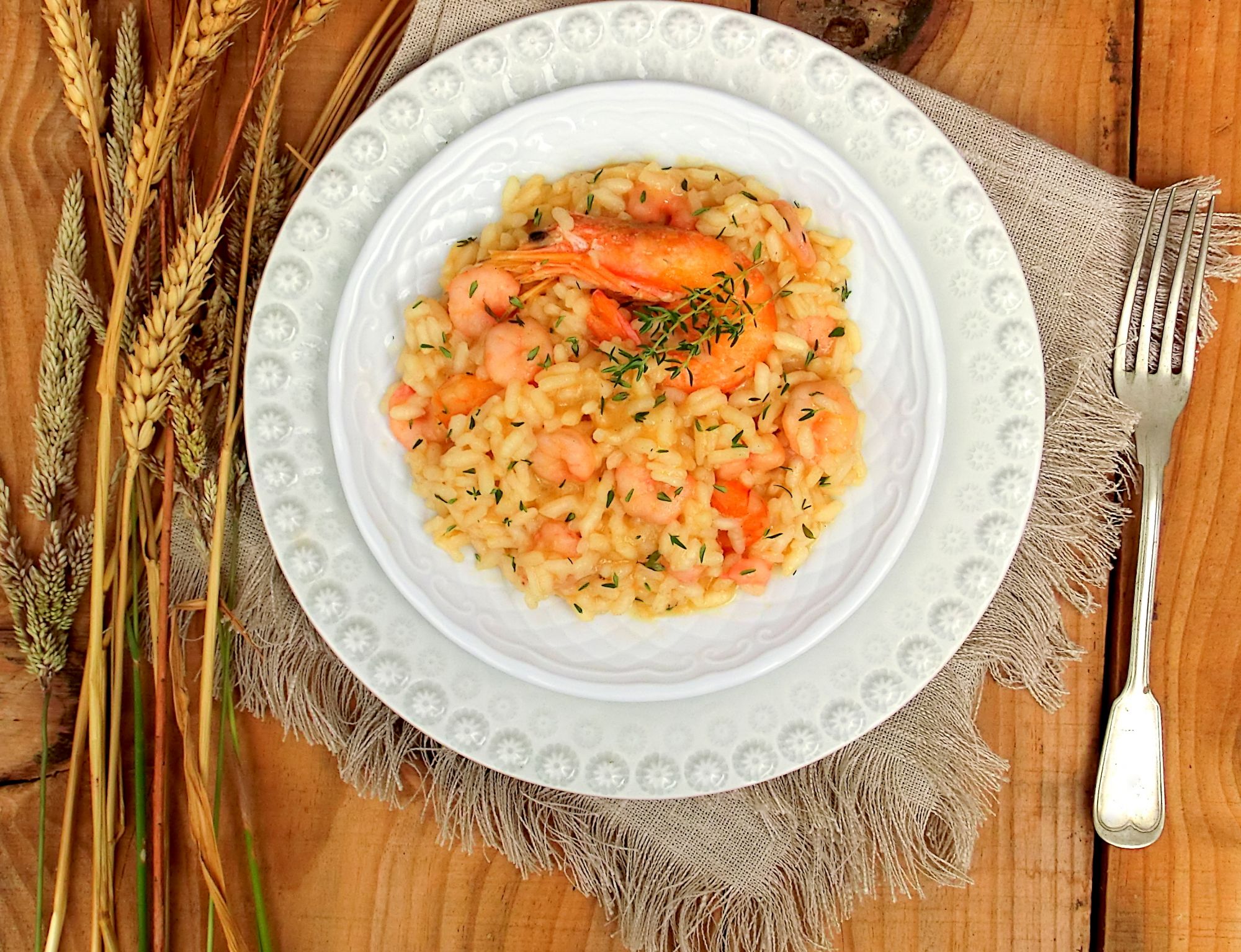 Quando o arroz já estiver no ponto, desligue o lume, acrescente uma colher de sopa de manteiga, polvilhe com tomilho fresco e sirva imediatamente.
