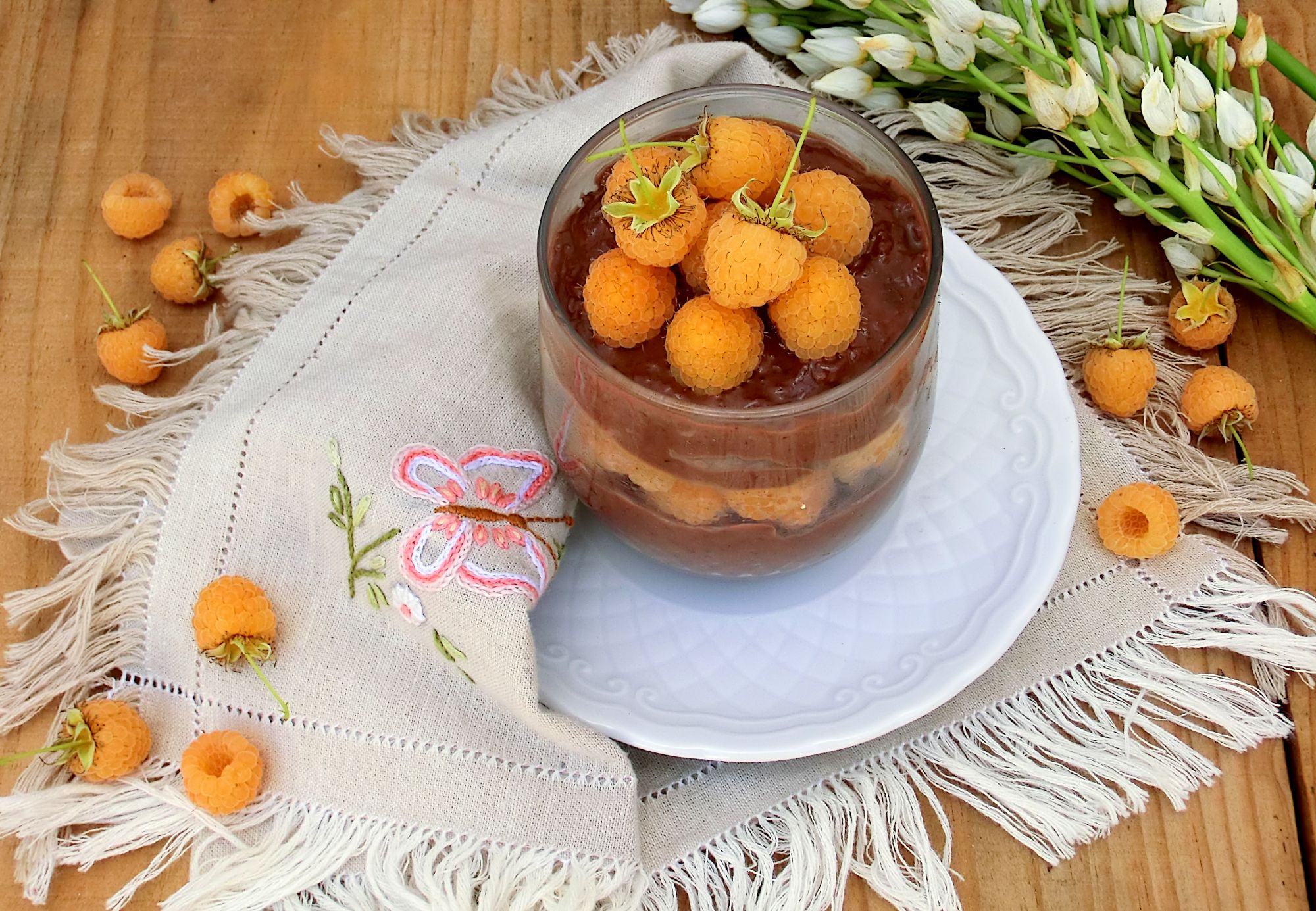 "Pot de Crème" de Chocolate com Framboesas Douradas