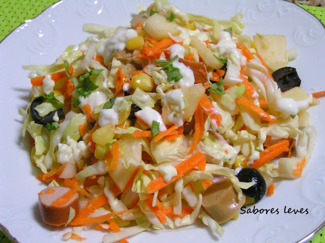 Misturar tudo numa saladeira e temperar com um pouco de maionese light ou molho de iogurte.