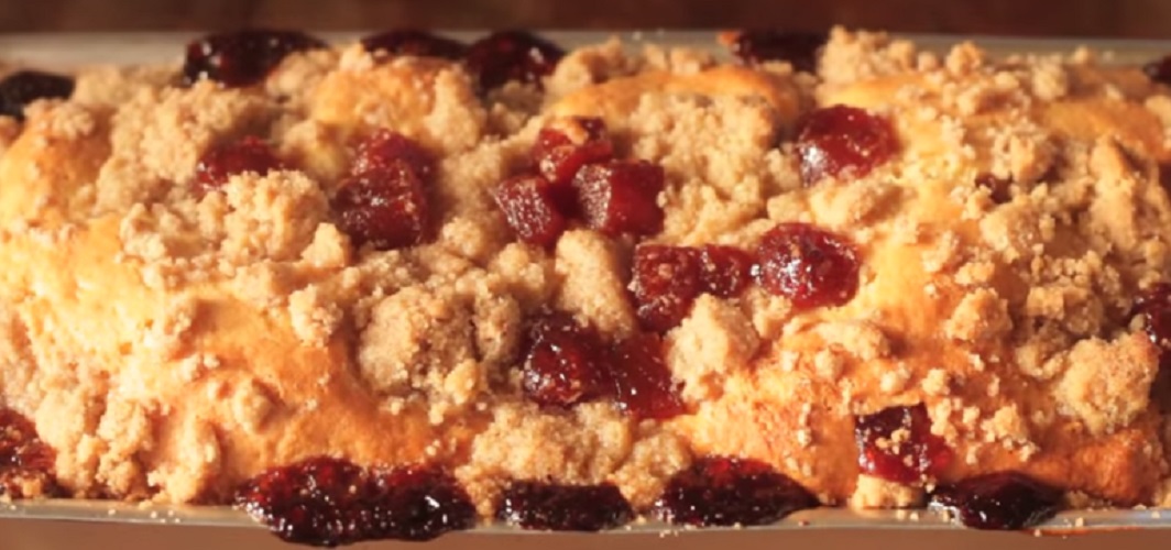 8. Distribuir a farofa por cima da cuca e depois o resto da goiabada.