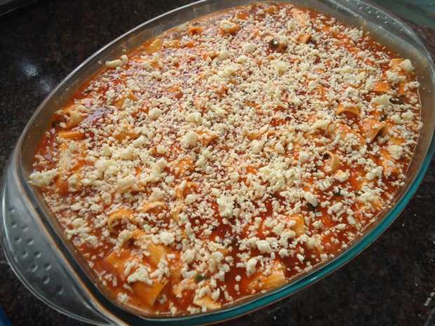 No outro dia, o que vai acontecer é que o molho vai “precozinhar” o macarrão, inchá-lo. Assim, salpique o queijo parmesão e leve ao forno para secar um pouco do molho e terminar de cozinha o macarrão. O ideal é que ele fique com um aspecto de torta de macarrão mesmo, quando você coloca no prato, ele desmancha alguns rigatonis, mas outros ficam inteirinhos e cheios de recheio.