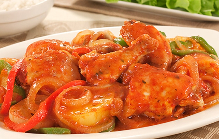 - Tire o frango do forno, junte os pimentões, espalhe o molho de tomate por cima, cubra com o papel-alumínio e asse por mais 20 minutos. Sirva em seguida.